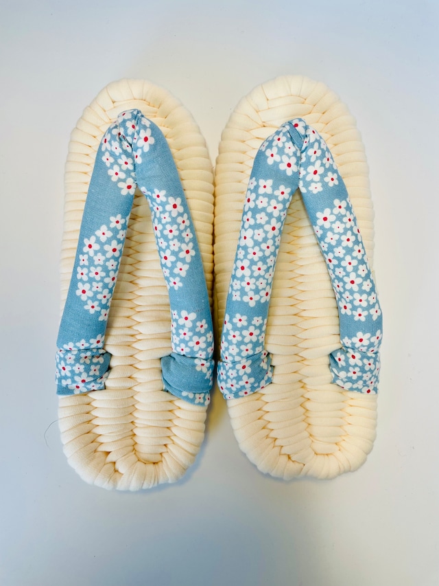 生成り天竺ニットの布ぞうり|ブルー小花柄鼻緒 Natural Cotton Knit Zōri with Blue Floral Thong
